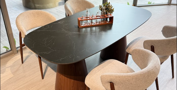 Smaller tables, especially rectangular 4-seater options, are perfect for pairing with a bench along one side. These setups allow the bench to slide fully underneath the table when not in use, freeing up walkways and keeping the area feeling open. Star Living’s range includes practical 4-seater tables like the CEYLON-N3 DINING TABLE and BALLOON SINTERED STONE TOP DINING TABLE, which balance everyday utility with space maximisation.